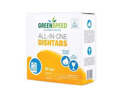 Greenspeed cleaning products are an ecological range of products produced with the core values of: efficient, sustainable, innovative and user-friendly. Greenspeed All-in-1 dish tabs contain a powerful degreaser, salt and rinse aid, which produce grease-free, stain-free results time after time. The tablets are easy to use and are suitable for domestic or semi-industrial dishwashers. Plant based and mineral ingredients. Phosphate free. The film wrapper is soluble and the packaging is made from recycled cardboard and can be recycled as paper and cardboard. Produced in an ecological factory for minimal impact on the environment.